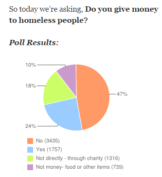 The results were interesting. While the largest grouping of those of you who took part said 'No' (47%), a quarter (24%) said 'Yes'. A meaning number (18%) give to charities working with homeless people, while 10% say they prefer to give other items – not cash – to people straight.